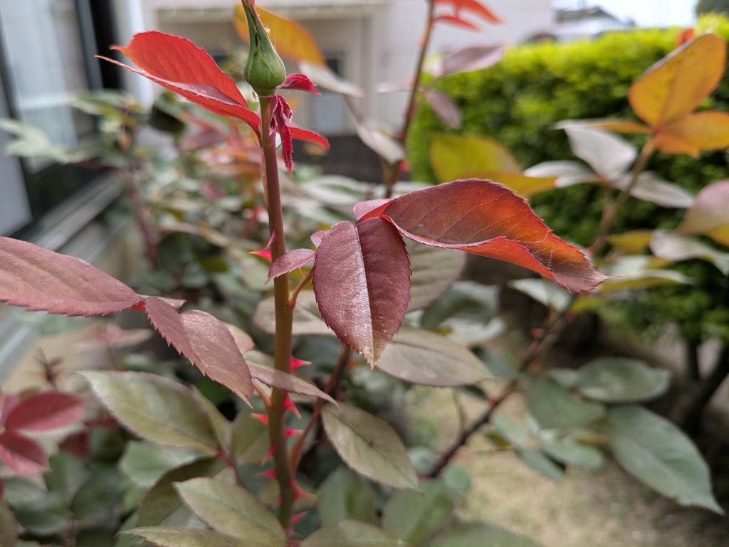 五月の連休のことです。朝起きると雨でした。その日は教え子の結婚式で、挨拶を頼まれていました。「あぁ~、雨か。」と外を眺めると、庭の薔薇に目が留まりました。赤い芽が50センチほど力強く成長しています。